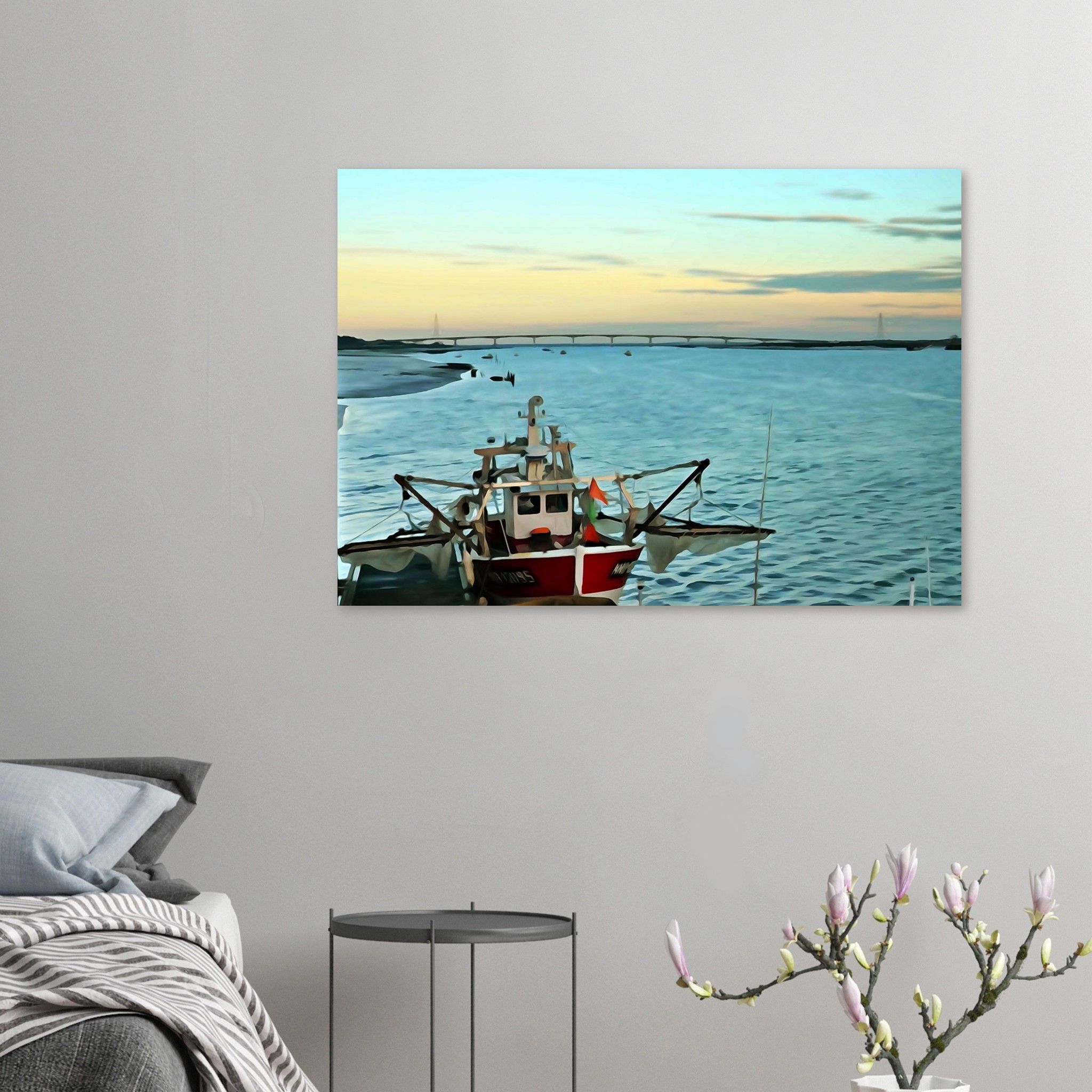 La composition visuelle de cette œuvre en fait un art mural contemporain facile à intégrer dans de nombreux styles de décoration intérieure : scandinave, minimaliste, bord de mer, design ou encore bohème chic. La simplicité discrète de la scène matinale permet d’apporter une touche de caractère sans surcharger l’espace.