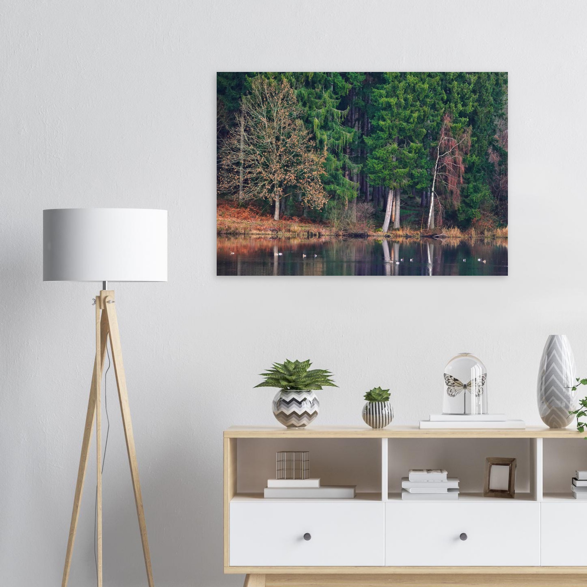 Invitez la sérénité d’un paysage naturel dans votre intérieur avec le tableau aluminium Le lac Auvergnat tient la forêt comme une photographie silencieuse. Cette œuvre minimaliste et poétique transforme immédiatement votre décor mural en un espace apaisant, grâce à un lac immobile qui reflète la forêt comme un miroir, dans une atmosphère silencieuse et contemplative. Imprimé sur aluminium DIBOND 3 mm, ce tableau mural offre un rendu mat antireflet, des couleurs vives et une profondeur unique pour une décoration murale élégante et contemporaine.